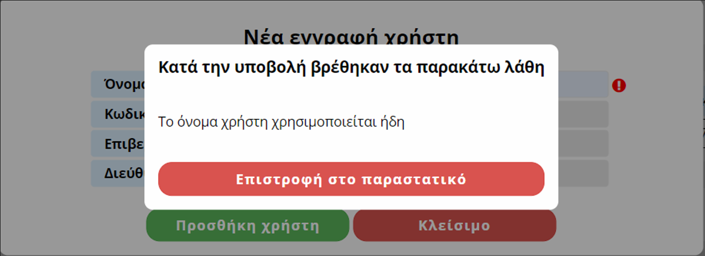 Σε περίπτωση λανθασμένης εισαγωγής του στοιχείων, όπως το όνομα χρήστη να χρησιμοποιείται ήδη ή μη έγκυρης ηλεκτρονικής διεύθυνσης, ο χρήστης θα λάβει ένα μήνυμα λάθος όπως το παρακάτω.