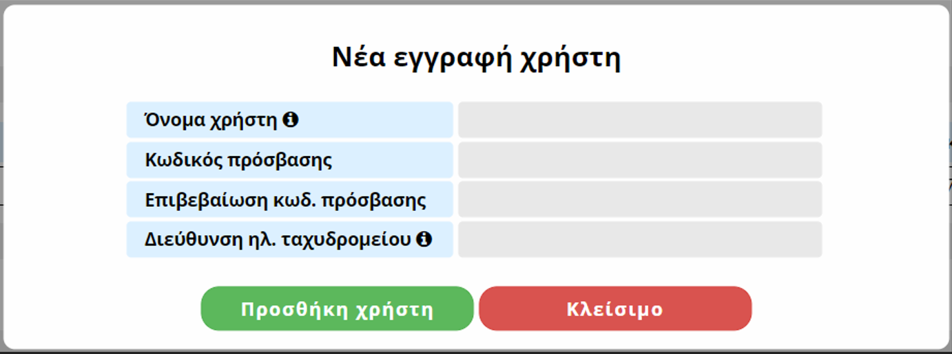 Στην φόρμα που εμφανίζεται ο χρήστης συμπληρώνει όνομα χρήστη που επιθυμεί, κωδικό πρόσβασης και email και επιλέγει “Προσθήκη χρήστη”.