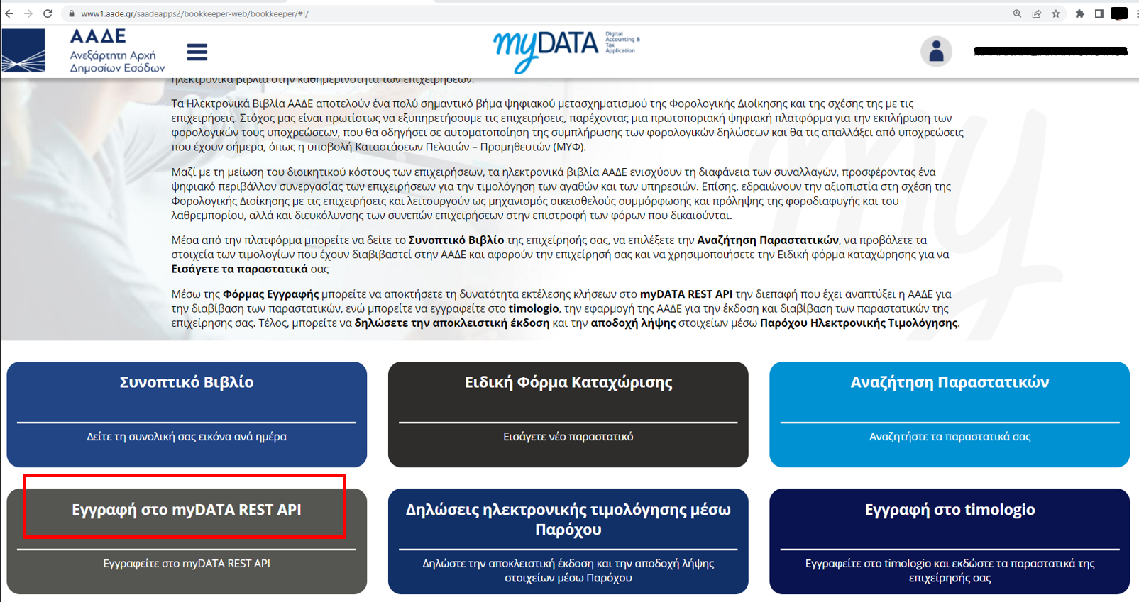 Αφού ο χρήστης συνδεθεί επιτυχημένα στη πλατφόρμα, θα εμφανιστεί η επόμενη οθόνη. Σε αυτήν ο χρήστης επιλέγει “Εγγραφή στο myDATA REST API”.